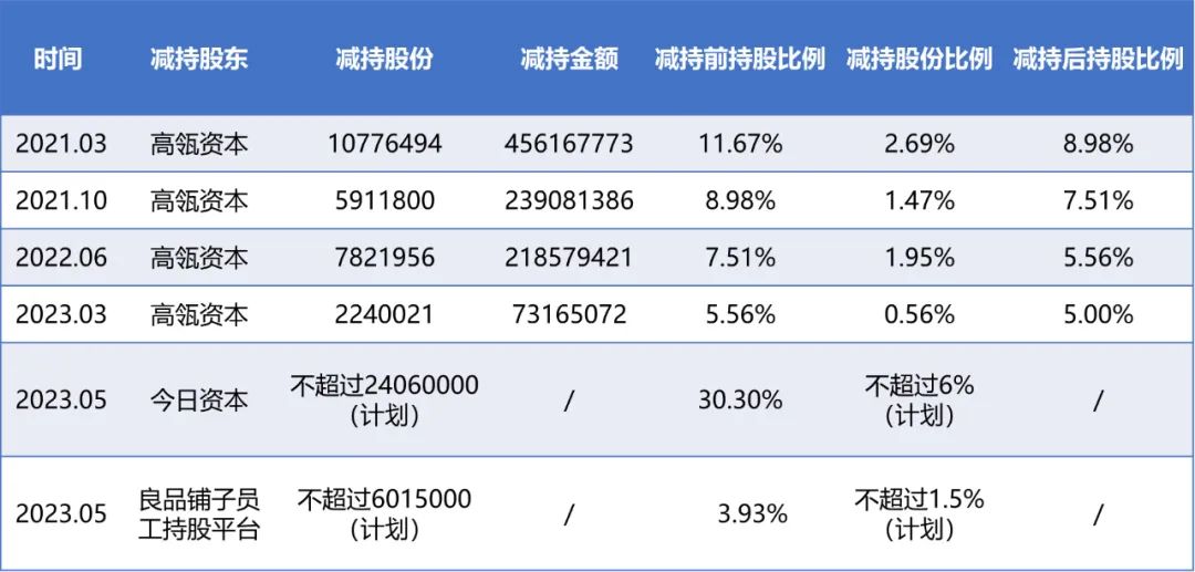 良品铺子上市以来主要股东减持情况,数据来源良品铺子财报,连线Insight制表