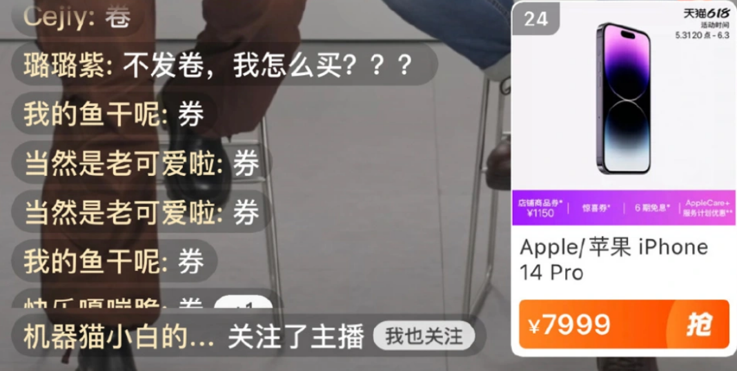 而用户问得最多的问题,就是为什么不直接卖货、不发优惠券。显然,这两个槽点更令人无法接受。直播间里虽然挂着24款苹果产品的链接,但详情页显示的是本次618活动的分期免息、官降和平台跨店满减优惠信息,并没有直播间直接派发的优惠券。在更多时间里,整个屏幕都被一个“券”字霸占,前来围观的“果粉”用行动表达着自己的不满和质疑。