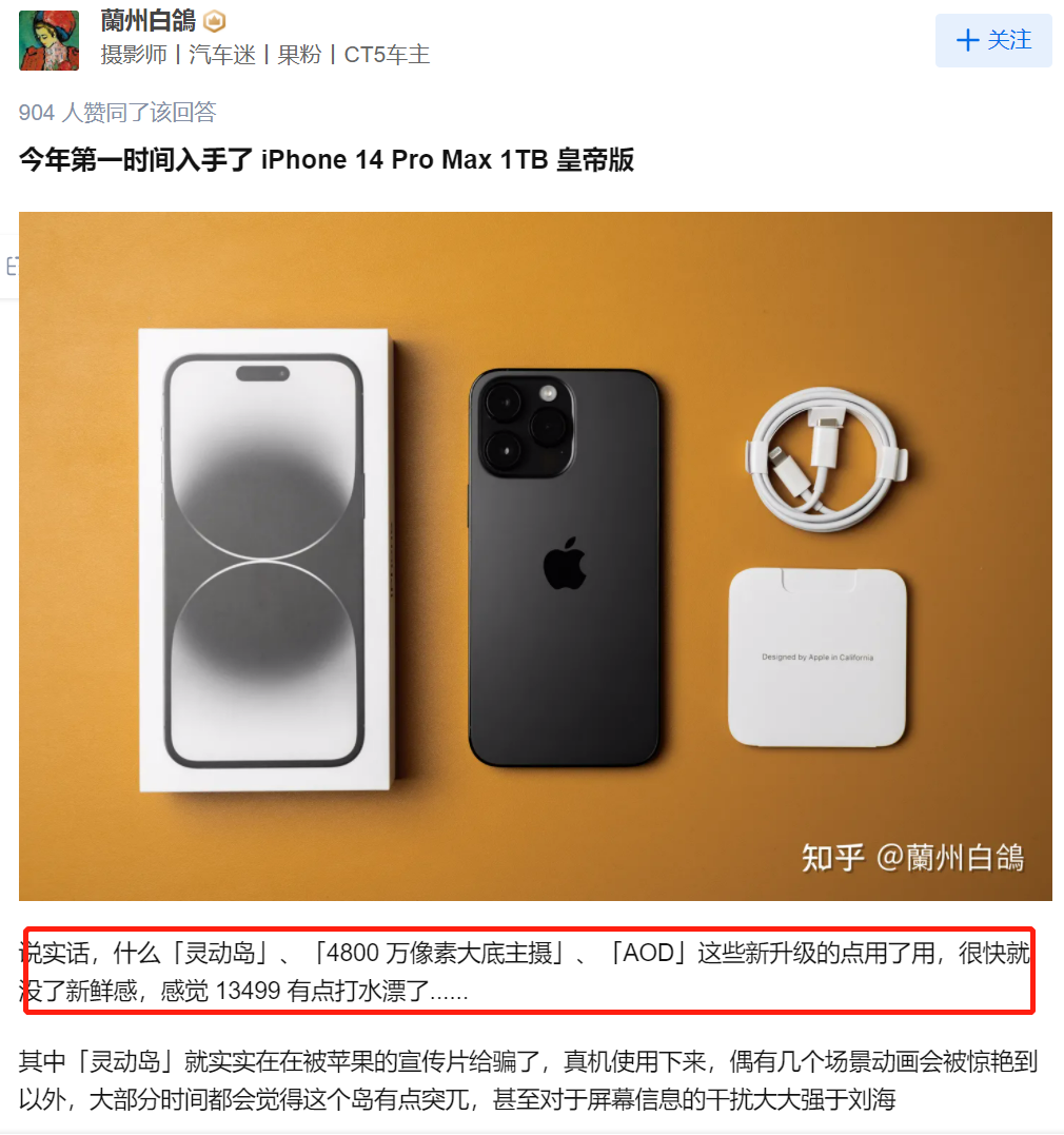 在知乎上有一个问题叫“买完iPhone 14 Pro你后悔吗”,前排高赞回答几乎都表达了不满,且焦点基本集中在技术、创意上。在个人介绍中就带有“果粉”标签的摄影师“蘭州白鴿”表示,灵动岛、4800万像素大底主摄、AOD这些升级亮点很快就没有新鲜感,“13499(元)感觉有点打水漂了”。