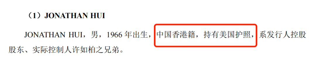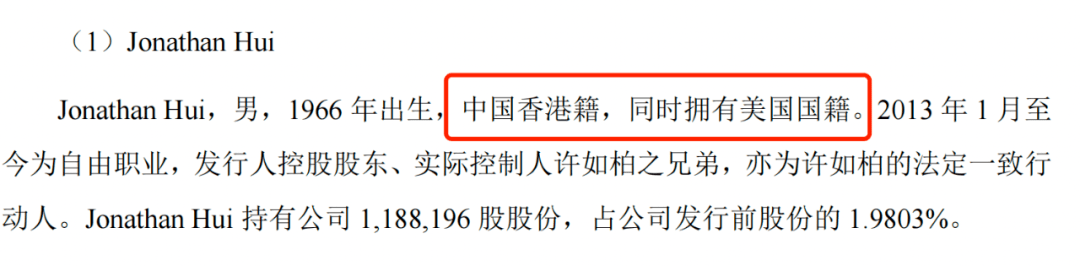 值得注意的是,公司今年5月25日发布的《创业板首次公开发行股票招股说明书(申报稿)》中显示,许如柏的弟弟JONATHAN HUI为中国香港籍,并持有美国护照。