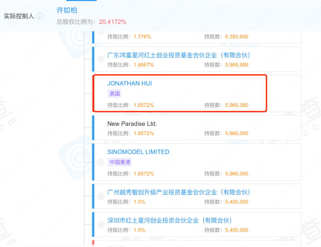 此外,「界面新闻·子弹财经」记者通过企查查来看辉芒微的股权结构图发现,JONATHAN HUI仍为美国国籍。