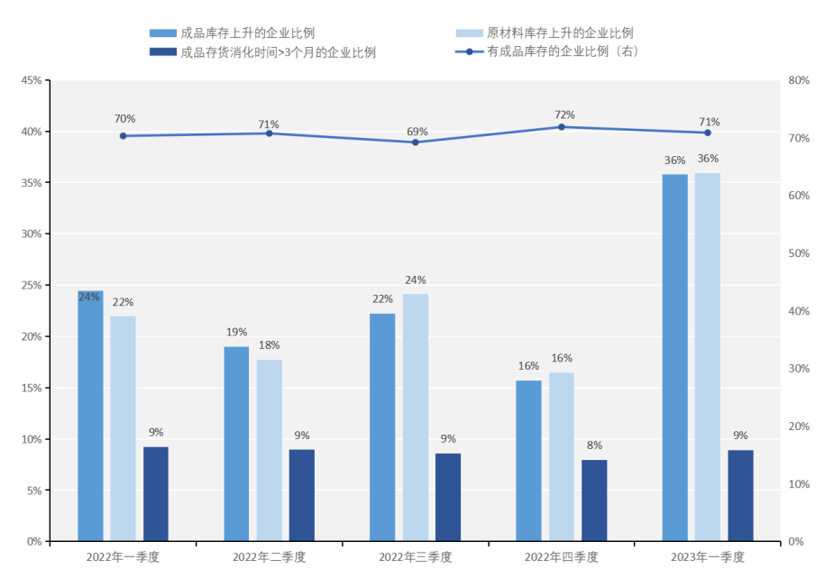 有成品库存的企业占比较为稳定,但成品库存和原材料库存上升的企业占比显著增加,一季度均达36%(图9)。