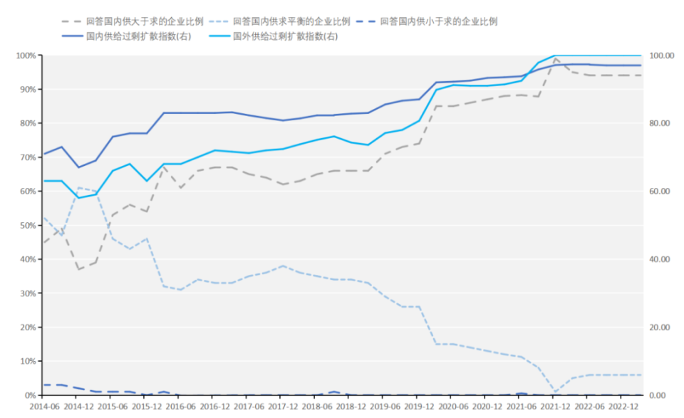 当前季度,无论国内供给过剩扩散指数(97)还是国外供给过剩扩散指数(100)都处于历史高位,且暂无下降趋势(图4)。