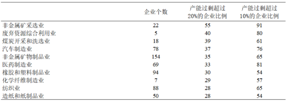 从行业角度,2023年一季度产能过剩严重的29个行业中前五位分别为非金属矿采选业、废弃资源综合利用业、煤炭开采和洗选业、汽车制造业、非金属矿物制品业(表2)。