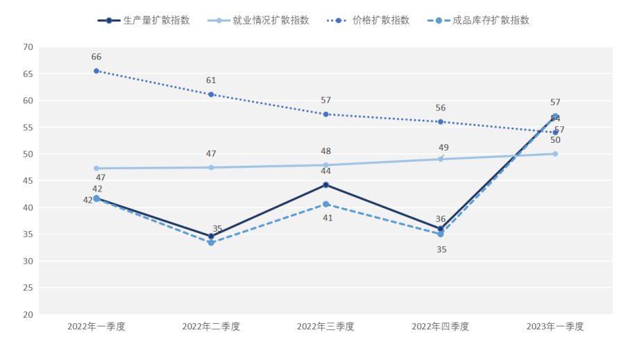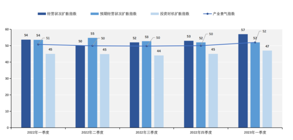 调研结果显示,2023年第一季度产业景气指数暂时摆脱了连续三个季度停滞在荣枯临界点的状况,展现出明显回暖的态势。