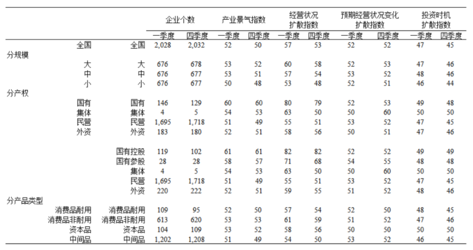 后者(52)较去年四季度未见改善,且低于今年一季度的经营状况扩散指数(表1)。