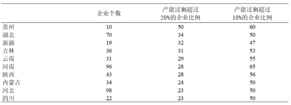 从省份角度,贵州、湖北、新疆、吉林、云南为前五大产能过剩省份。贵州新进入前五大产能过剩省份且列首位,黑龙江和辽宁则下榜(表3)。