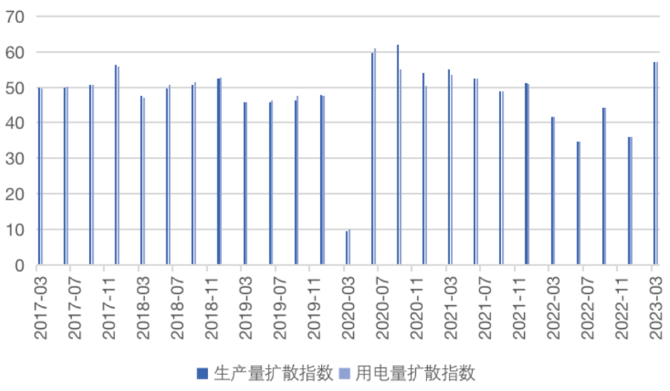 从反映实际生产状况的生产量扩散指数(57)及用电量扩散指数(57)考察,二者较2022年一季度、2022年四季度均有较大幅度的提升,佐证了今年一季度产业生产经营活动的回暖。
