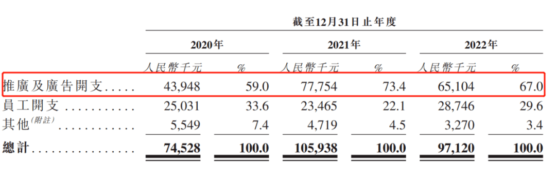 这几乎与营销费用不相上下。上述同期时间内,企业销售及营销开支分别为7452.8万元、1.06亿元、9712万元,分别占同期收入的28.2%、26.6%、19.4%。其中,平均每年超6000万元的资金用于推广及广告。