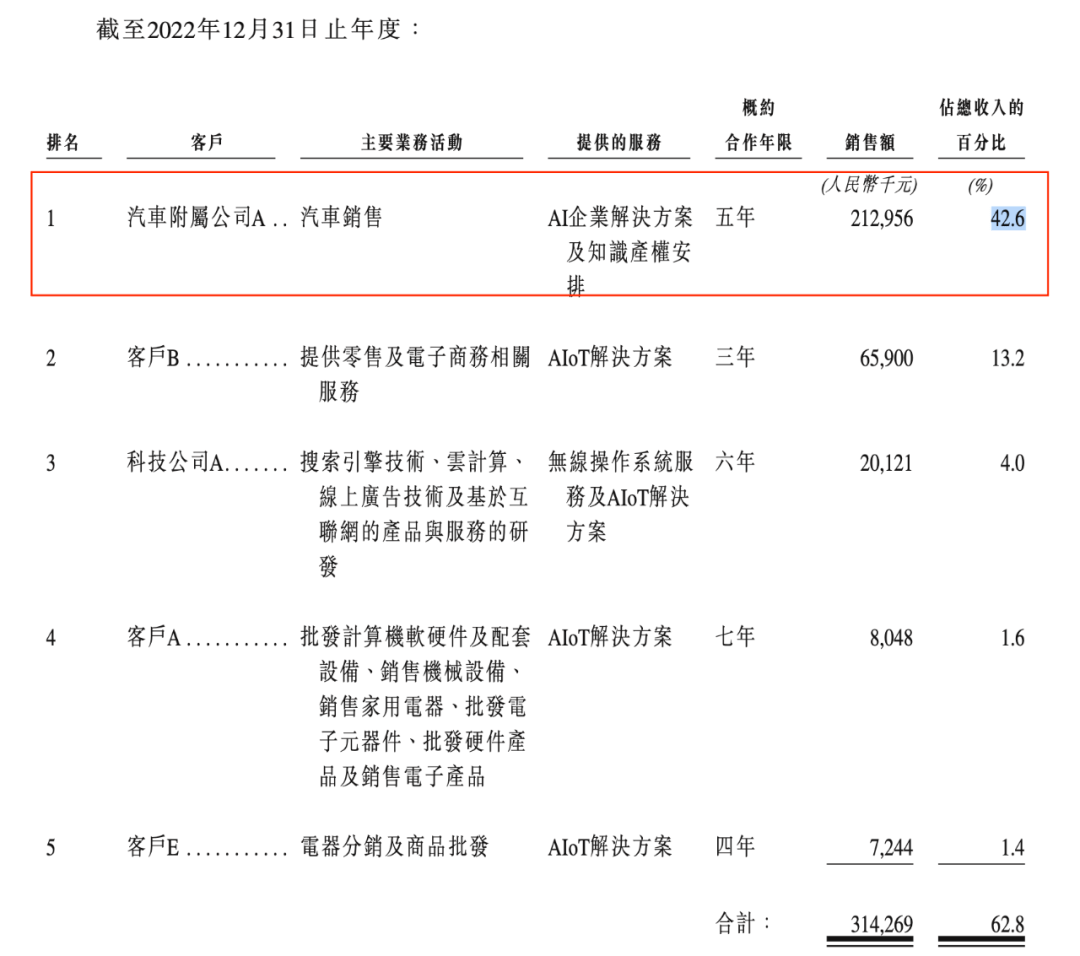 就在2022年,出门问问为这位来自汽车行业的最大客户提供了AI企业解决方案及知识产权安排服务,从而获得了2.13亿元收入,占总收入比例为42.6%。