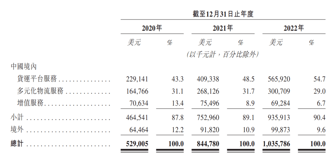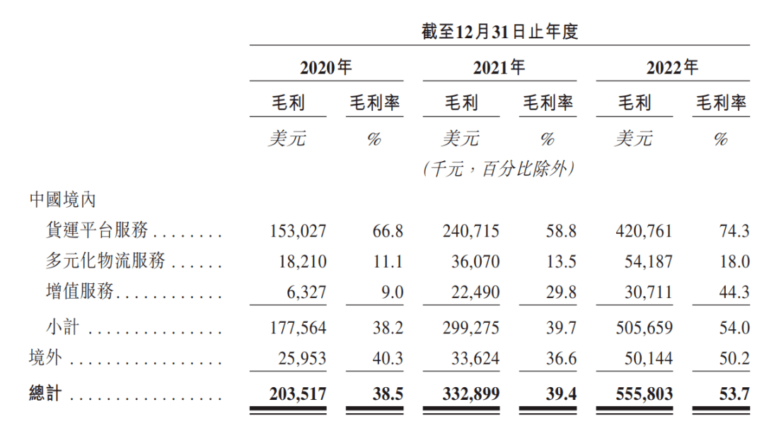 从营收来看,货运平台服务是整体营收的支柱,2020年占比达到43.3%,2022年则增长至54.7%。多元化物流服务营收占比微弱下调,基本上保持在30%左右。增值服务营收占比则出现了较大程度的下滑,由2020年的13.4%降为6.7%,还比不上境外收入。