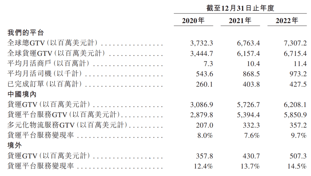 招股书显示,货拉拉境外GTV从2020年的3.57亿美元增长至2022年的5.07亿美元,货运平台服务变现率从2020年的12.4%增长至2022年的14.5%,营收则从2020年的6446万美元增长至2022年的9987万美元。