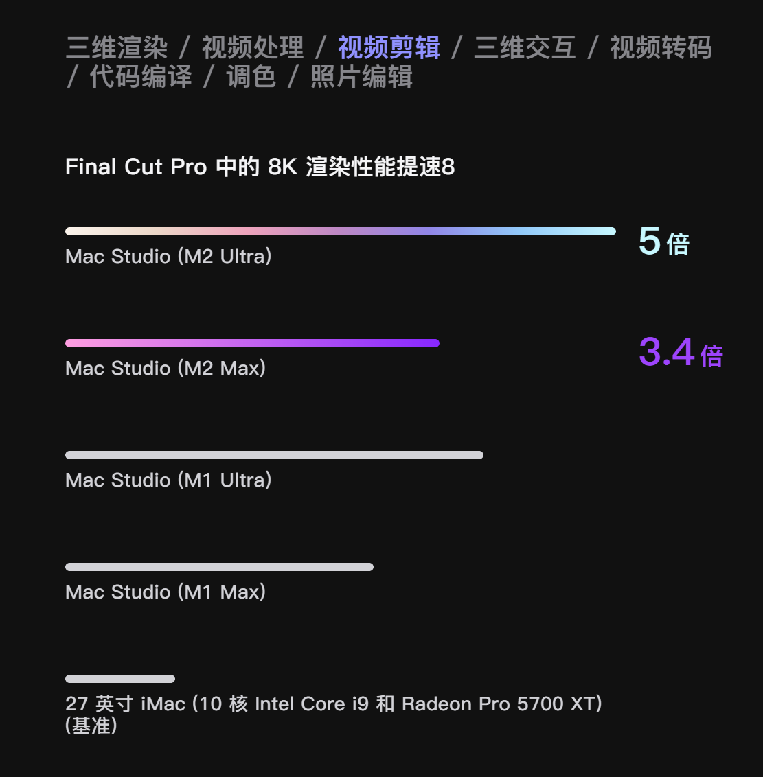 按照苹果的说法,得益于192G的运行内存,M2 Ultra自己就能进行机器学习训练,这是目前大部分主流显卡都无法做到的事情。而且搭载M2 Ultra的Mac可以同时播放22路8K ProRes视频,这也是目前市面上绝大多数PC所做不到的,毕竟苹果针对视频编码方面下了不少功夫,能在这个领域远远超过竞争对手也是情理之中。