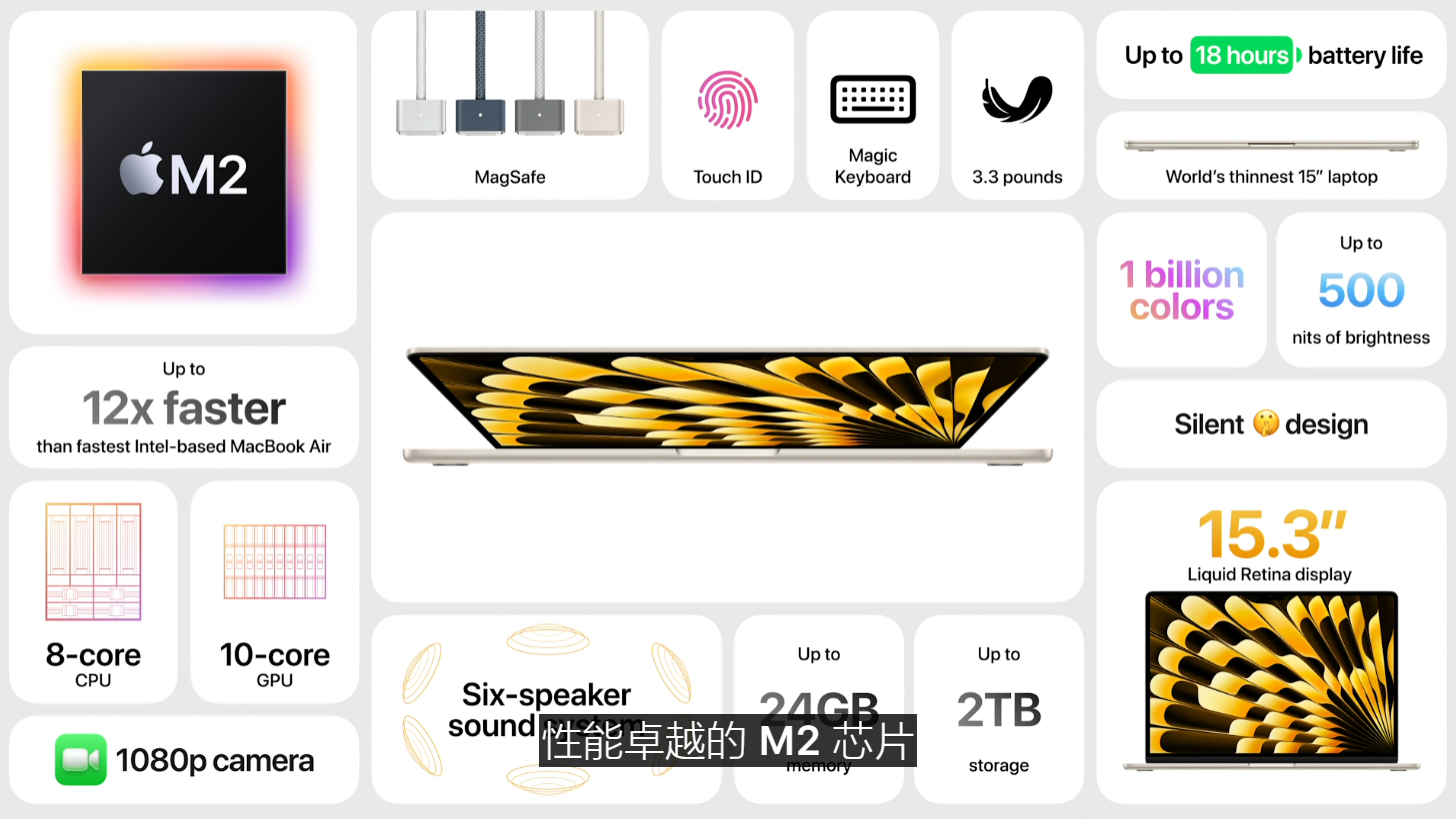 本场发布会公布的第一款产品是MacBook Air 15英寸版,它拥有一块15.3英寸的显示屏,因此在显示面积上要远比之前的MacBook Air大上不少(原版为13.6英寸)。不过除了屏幕和电池容量外,15英寸版MacBook Air与之前几乎没有任何区别,同样的外观设计、同样的处理器以及同样的接口数量等等。