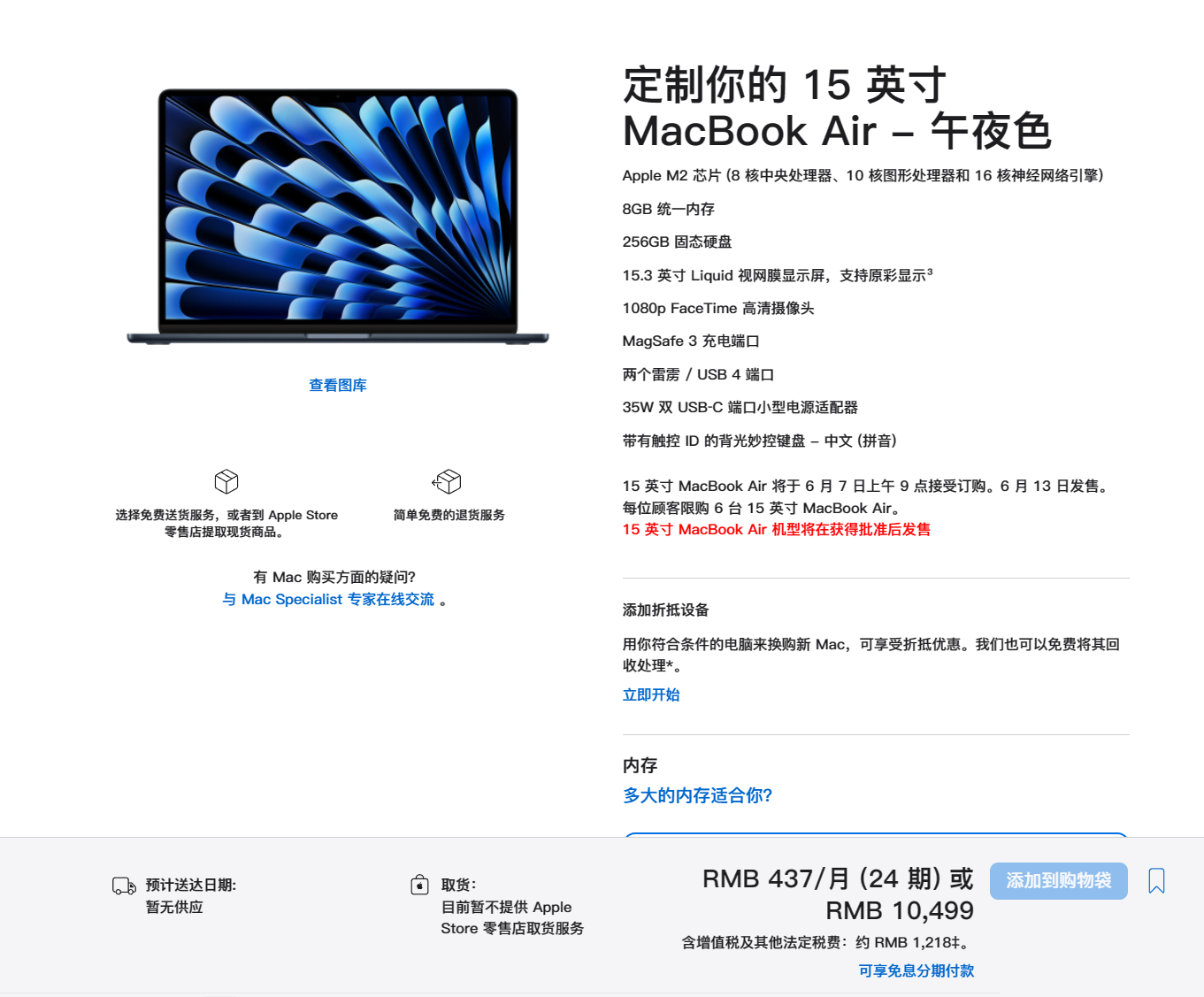 值得一提的是价格方面,MacBook Air 15英寸的起售价为10499元,比现售的MacBook Air 13英寸版贵了1000元。有意思的是,苹果还下调了MacBook Air 13英寸(M2版)的起售价,具体为8999元,相比之前便宜了500元。但小雷简单查询了一下电商平台的报价,M2版MacBook Air最低价可以做到8199元(两者均为京东自营最低价),优惠力度并没有我们想象中那么大。