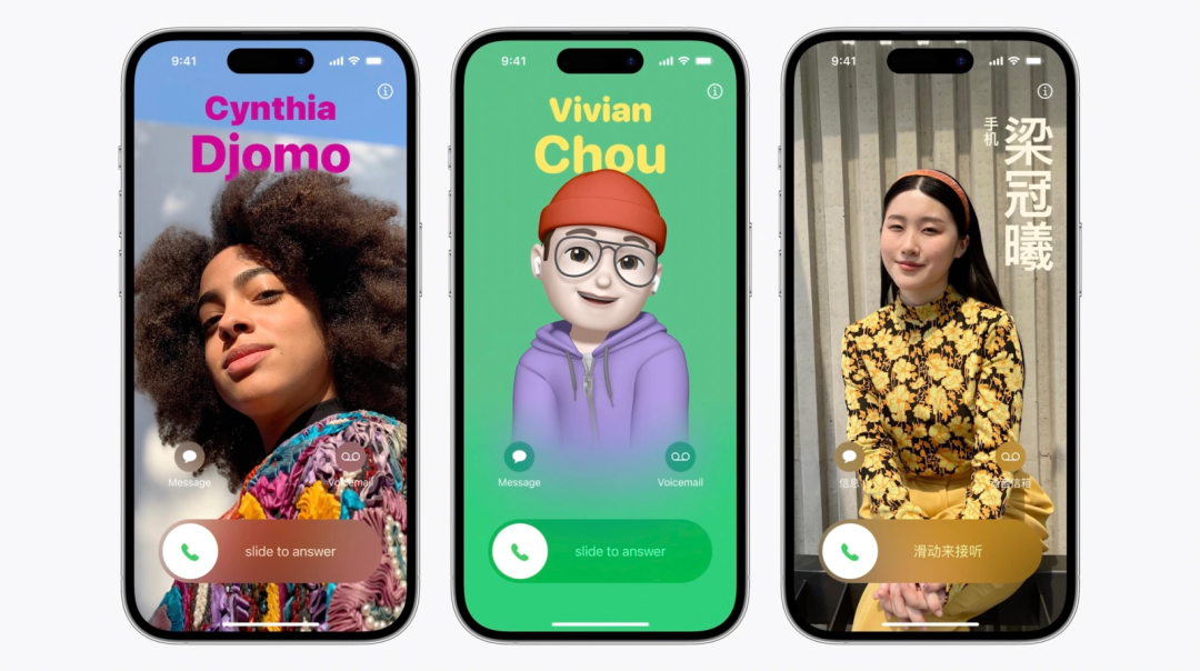 首先介绍的是 iOS17 的通讯录功能大升级,新增了一个名为「海报」的功能,联系人卡片变得更加个性化,同时联系人来电界面也可以实现自定义,库克还特别表示针对中文与日文的排版做了更加深度的定制优化,使其看起来更加自然协调。