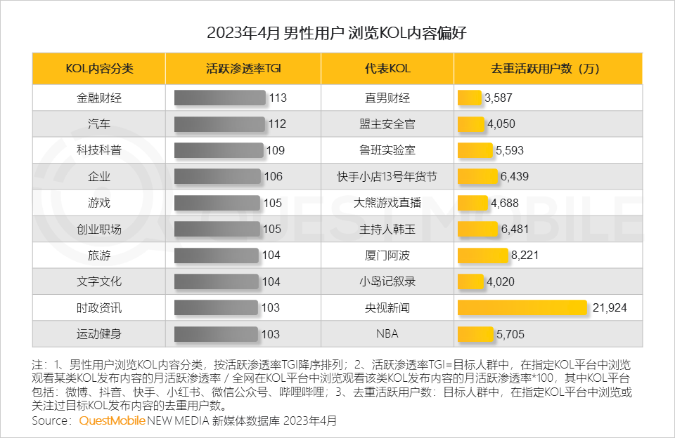 2、男性用户对汽车资讯内容保持高关注热度,购车需求更加旺盛;汽车品牌加强KOL平台营销,多官方号矩阵触达男性购车群体