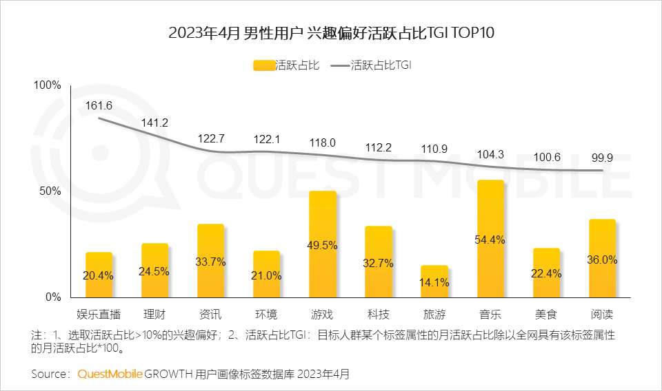 4、男性人群对理财、游戏、科技等多个方面展现浓厚的兴趣,泛娱乐属性突出