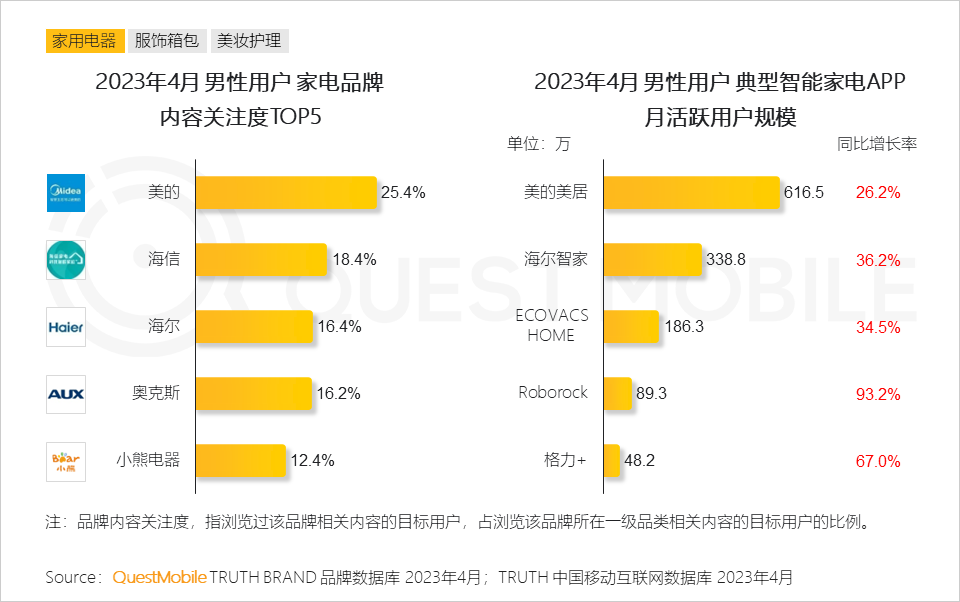 4、家电产品向科技化、品质化、智能化升级,激起男性消费者“尝鲜”的购买欲,成为智能家电消费的新增长极,国货品牌为消费主流