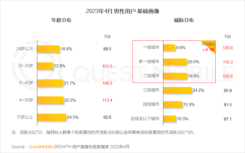 QuestMobile数据显示,截止2023年4月,全网用户中男性用户占比50.5%,总数达到6.11亿,31岁到50岁区间占比43.9%,一线、新一线、二线城市占比接近五成,同时,在全网用户人均月度使用时长同比下降1.2%的背景下,男性用户人均使用时长同比增长了1.0%,达到163.8小时,殊为不易!