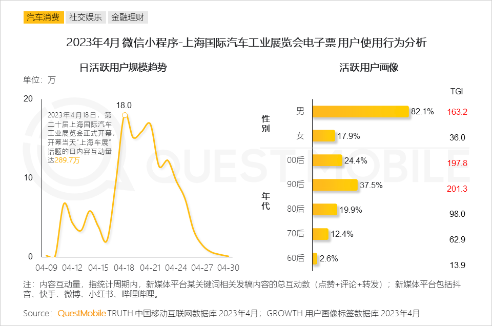 4、上海车展期间,相关话题新媒体平台声量持续走高,汽车智能科技、新车首发成讨论焦点,男性用户参展体验的积极性更高