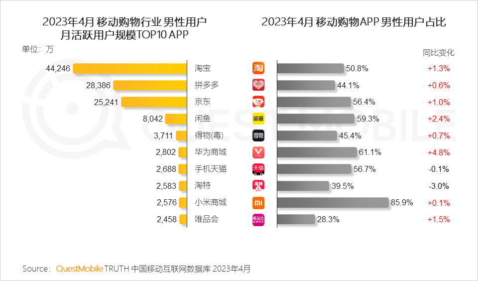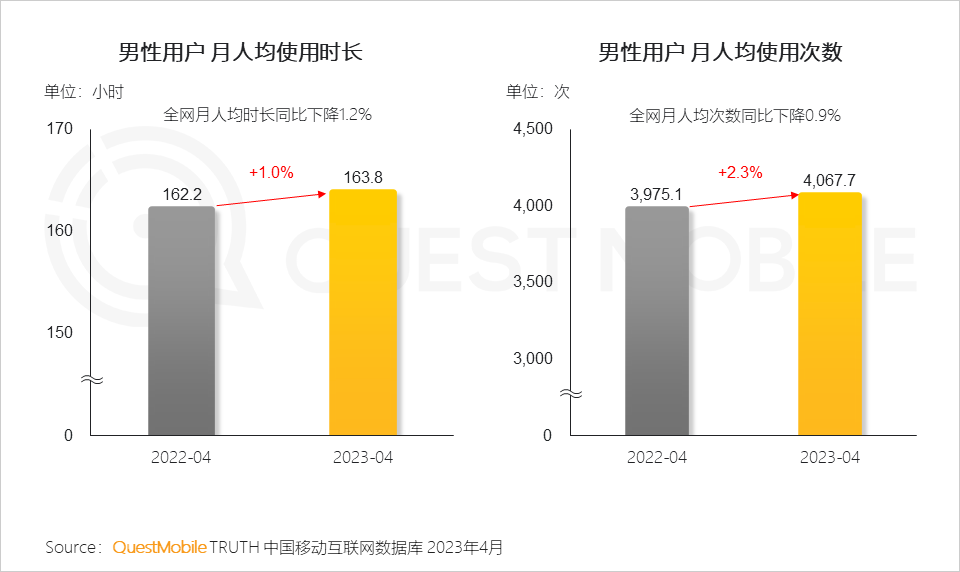 QuestMobile数据显示,2023年4月,男性用户月人均使用时长达到163.8小时,同比增长1.0%。