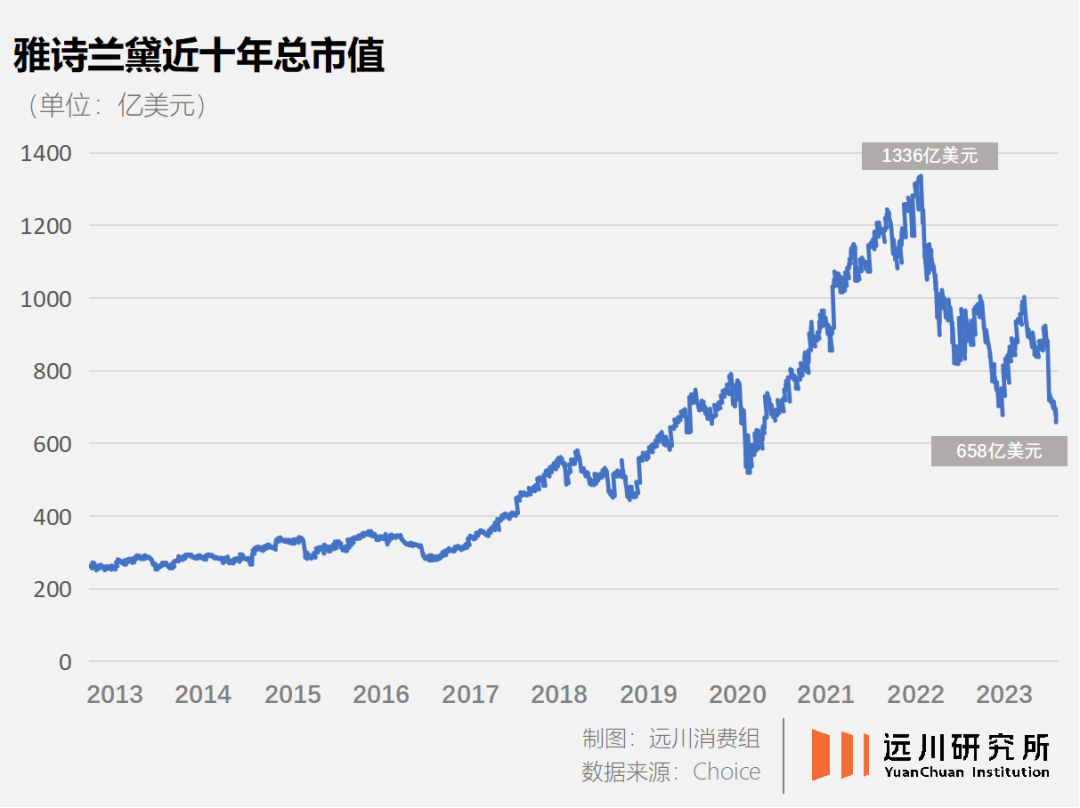 雅诗兰黛家族吓没吓倒不好说,股东们倒是真的怕了:就在财报发布后,雅诗兰黛股价一度暴跌21%,创下1995年上市以来的单日最大跌幅[3]。如今相比2022年初的最高点,雅诗兰黛的市值腰斩,只剩658亿美元。