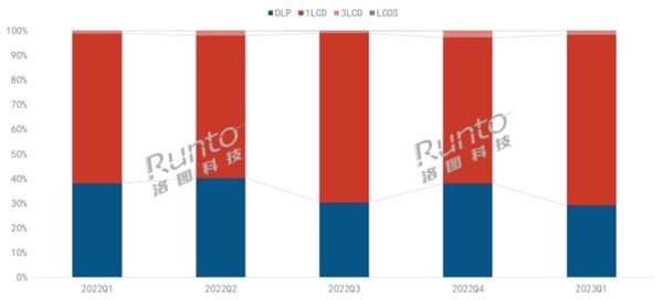 到了今年第一季度,LCD产品对DLP产品的“侵袭”更加严重。根据洛图科技的线上数据显示,2023年一季度,1LCD技术的线上市场份额提升至69.2%,较去年同期上涨8.4个百分点,DLP产品在线上市场中的份额则降至30%以下。