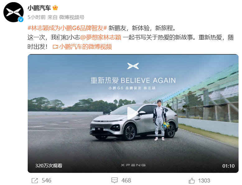 更重要的是,小鹏汽车之所以选择林志颖当小鹏G6代言人,也是为自己的发展前途赌上一把。