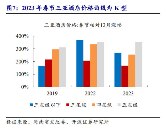 2023年的消费,也呈现一定的高端和低端消费改善较快,中产阶层消费降级,比如2023 年春节期间三亚酒店五星级和三星级以下涨幅较高,而疫情前酒店星级和价格涨幅为线性增长关系。