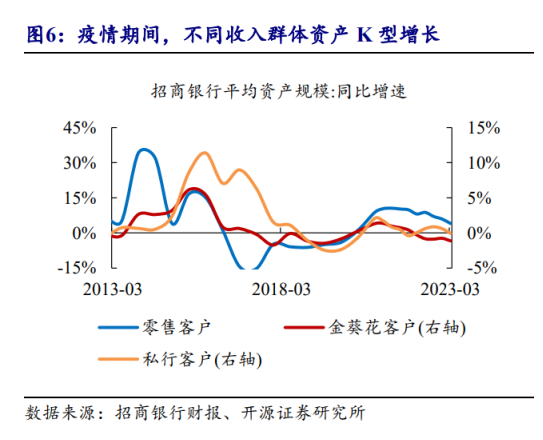 招商银行财报显示,2022 年,私行(1000 万元以上)、零售(50 万元以下)、金葵花(50-1000 万元)的人均资产规模增速分别为 0.6%、6.0%、-0.8%,即一高一低的私行客户、零售客户资产扩张,而代表中产阶层的金葵花客户资产受损。