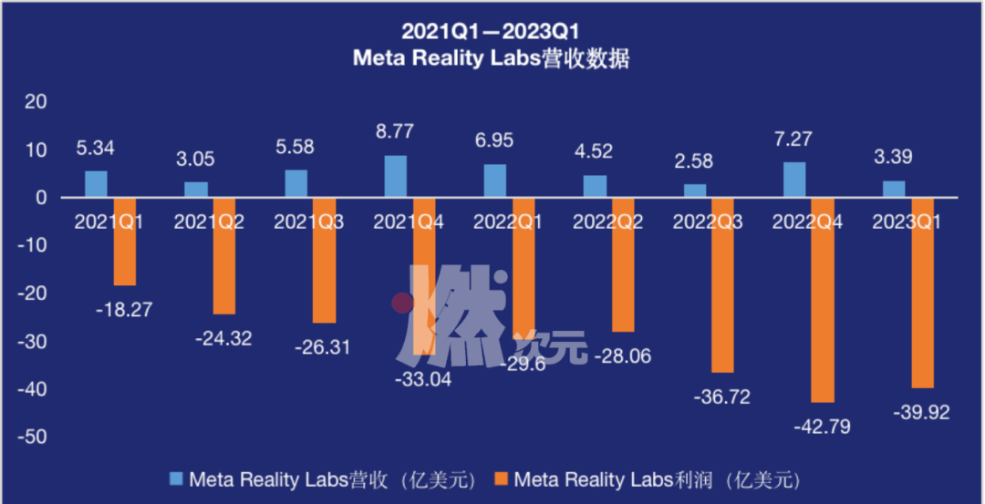 以Meta为例,2022年,Meta的Quest系列产品已经占据市场份额的80%。但就是这样一个行业头部玩家,其2023年第一季度财报数据中,包含Quest业务的Reality lab业务仍在面临将近40亿美元的季度亏损,且从2021年第一季度开始每个季度都有超过15亿美元的单季亏损。