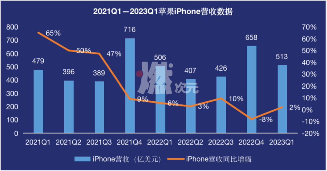 2023年第一季度(时间为自然年,以下未标注则同)的苹果财报中,iPhone实现营收513亿美元,高于彭博预期的489亿美元。而在财报披露前,IDC已经披露了本季度全球智能手机同比下降14.6%,苹果同期出货量仅下滑2.3%,已经远优于行业水平。