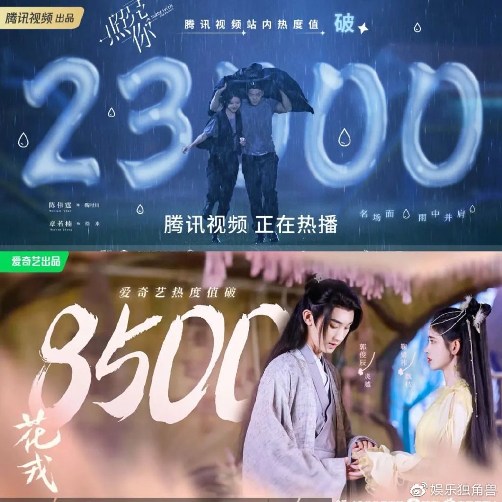 虽然甜宠剧没有花落顶流家,但市场上仍不缺少相关内容。6月上新了两部剧十分契合暑期档的氛围。陈伟霆、章若楠合作的消防题材《照亮你》,开播后收视率表现平平,腾讯视频站内热度却破23000,台网表现差异大,浓烈的爱情元素明显更受网络端年轻人欢迎。鞠婧祎主演的仙侠轻古风剧《花戎》在爱奇艺站内热度破8500,也打破了前段时间优酷连续两部古偶剧《长月烬明》《护心》一家独大的场面。
