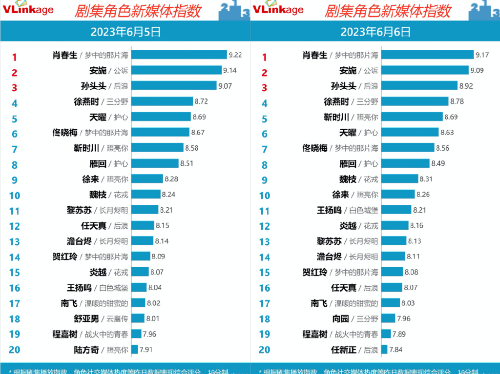 《梦中的那片海》播出势头强劲,与肖战的个人人气与号召力有关,他饰演的肖春生,在近日的VLinkage剧集角色新媒体指数排行第一位,《公诉》中迪丽热巴饰演的安旎,《后浪》中赵露思饰演的孙头头分别排在二、三位。以往,年代剧、公检法剧和中医传承题材一般与老戏骨挂钩,如今现实题材流行之下,90后流量型演员向正剧转型也势在必行,现实题材也同样需要他们来吸引新受众,就看谁能成功穿透次元壁,实现戏路的拓宽与升级。