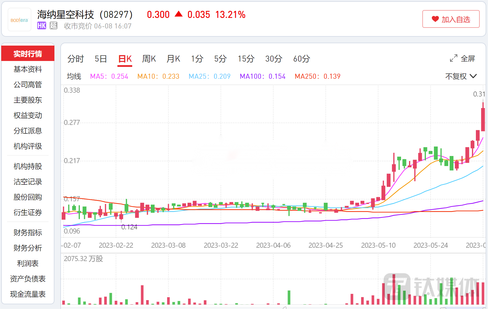 6月8日港股开盘后,海纳星空科技(08297.HK)股价持续走高,盘中高见16.98%,报0.31港元,创今年股价新高。钛媒体APP发现,自5月以来,海纳星空科技股价已累计大涨超115%。