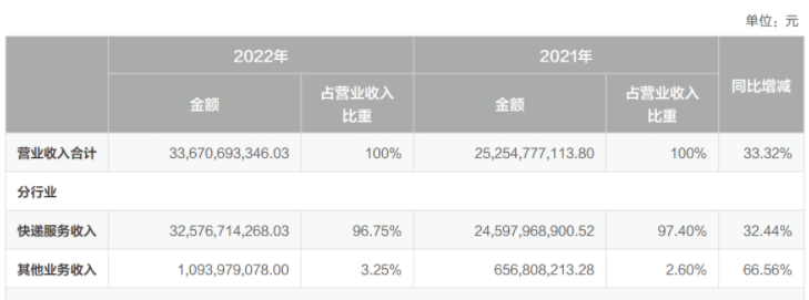 财报数据显示,2022年,申通快递完成快递业务量129.47 亿件,同比增长 16.89%;市场占有率为 11.71%,同比上升 1.48 个百分点;实现营业收入 336.71 亿元,同比增长 33.32%。![]()