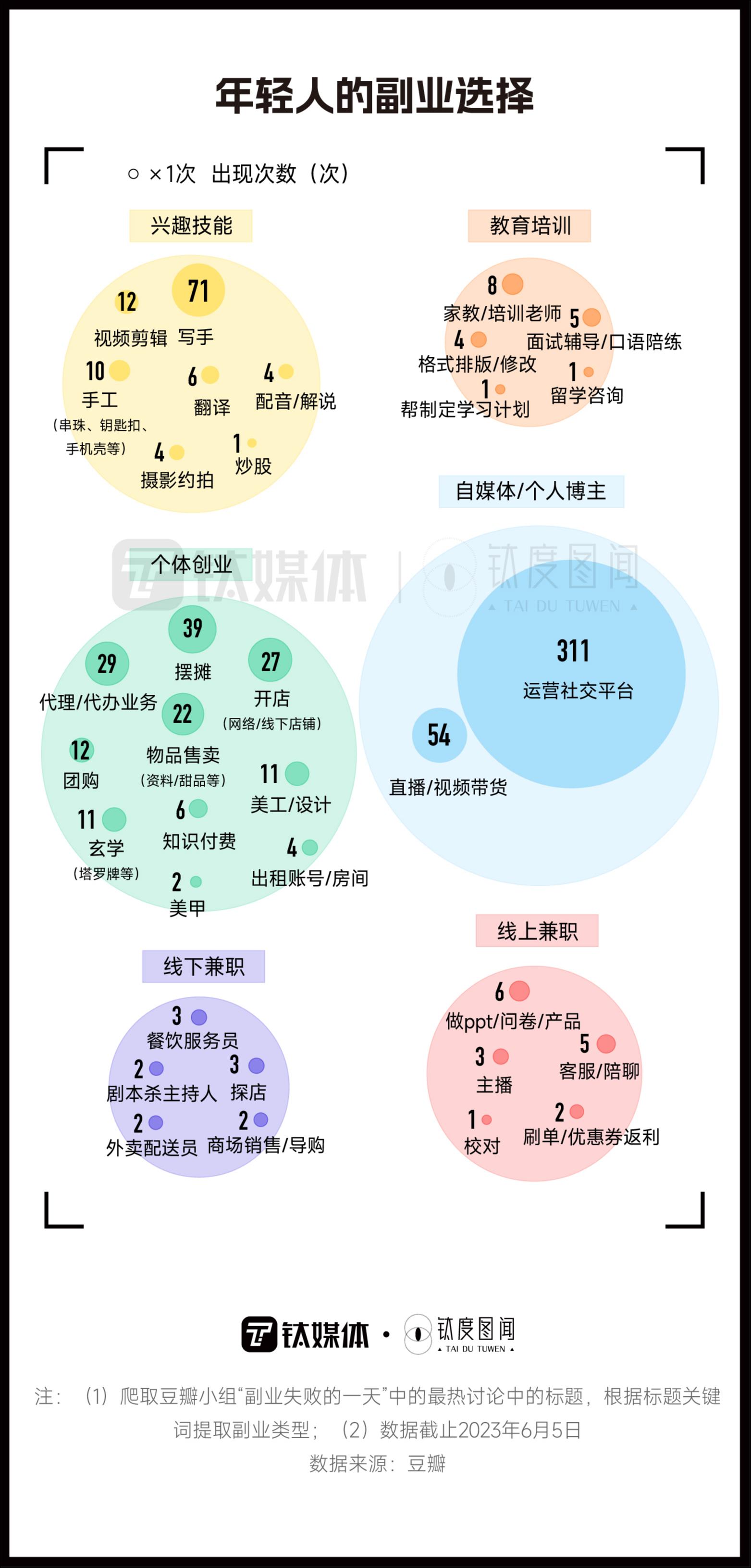 想要赚钱,需要知道自己想做什么。相较于难以自我做主的主业,副业类型已经被年轻人开发的五花八门。在豆瓣小组“副业失败的一天”中,有近28万人在讨论有关副业的心得和经验。据钛媒体·钛度图闻统计,做自媒体成为年轻人热度最高的副业选择,他们在不同社交平台上经营着自己个人账号,分享穿搭、拍摄视频等吸引流量,达到一定粉丝数量后获取变现;其次是写手,不管是写小说还是、书评、合作稿、推文,年轻人利用自己的兴趣技能在业余时间赚取收益。此外,还有视频剪辑、手工、翻译、摄影约拍等。
