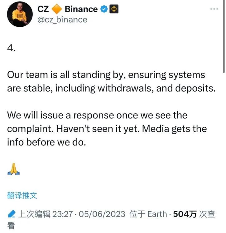 以数字“4”开头,赵长鹏在6月5日发推文表示,团队已经在待命,确保系统稳定,包括取款和存款业务。末尾不忘表态:“一旦收到投诉,我们会做出回应,但还没收到,媒体比我们先获知了该消息。”