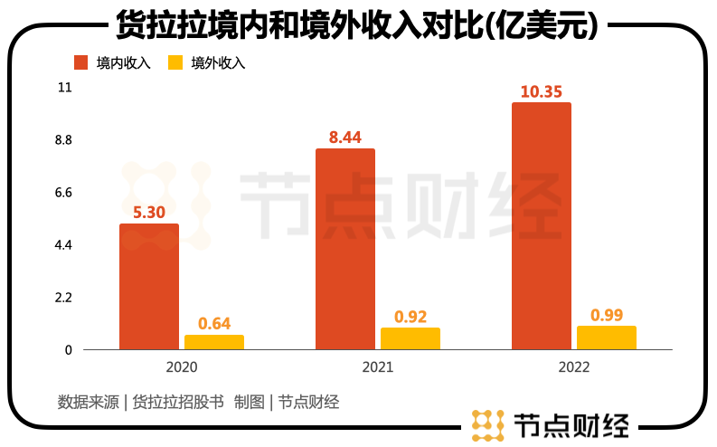 一直以来,境内都是货拉拉的最大收入来源地区。2020年,公司的境内收入为5.3亿美元,占比达87.8%。此后,境外收入的占比不仅没有上涨,反而在持续下滑。2021年,境外收入规模为0.92亿美元,占比为10.9%,2022年进一步下滑至9.6%,境内收入的占比在此期间持续提高,2022年已达到90.4%。