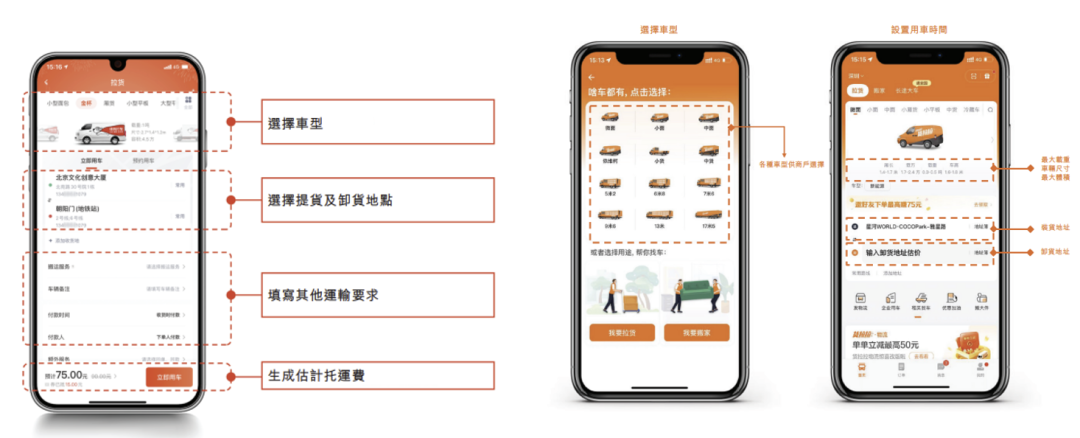 以上是快狗打车(左)和货拉拉(右)的服务界面,可以看到货拉拉提到的“闭环”环节,快狗打车基本都具备。