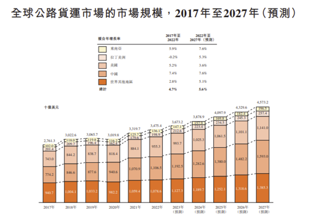 按照市场规模划分,货拉拉所在的同城物流市场是在公路货运市场的第二大细分市场。2022年,全球同城物流市场的规模为8178亿美元,整个公路货运市场的规模为3.5万亿美元。按GTV计,中国市场占全球市场的31.8%,是全球最大的单一公路货运市场,2022年的GTV为11065亿美元,有约1.7亿家商户和约1700万名司机。