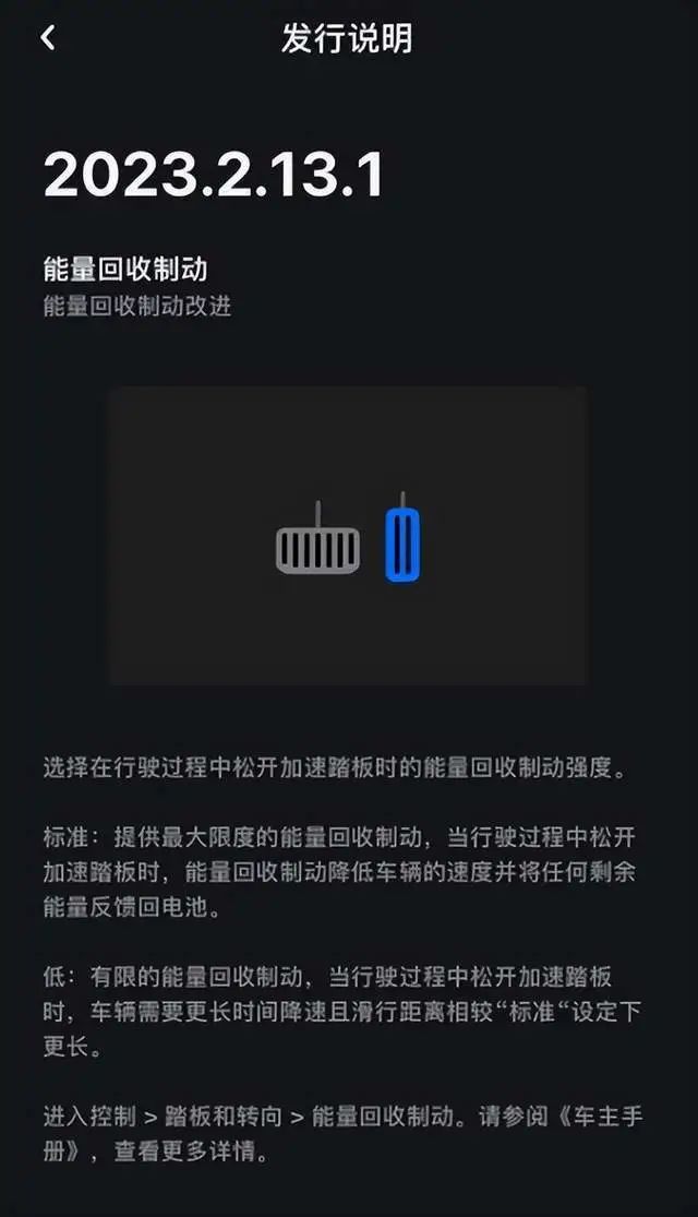 前段时间,特斯拉通过远程升级(OTA)技术,升级后允许驾驶员选择能量回收制动强度,也可在在驾驶员长时间深度踩下加速踏板时发出提醒,降低因长时间深踩加速踏板导致速度过快而引起的碰撞风险。
