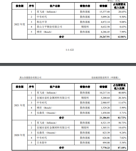 收入规模逐年增长,主要获得安森美、英飞凌、中车时代、博世等客户的助力。据招股书,黄山谷捷2020-2022年来自前五大客户的销售收入分别为7770.23万元、 21386.01万元和34267.91万元,占营业收入的比例分别为87.18%、83.72%和63.86%。