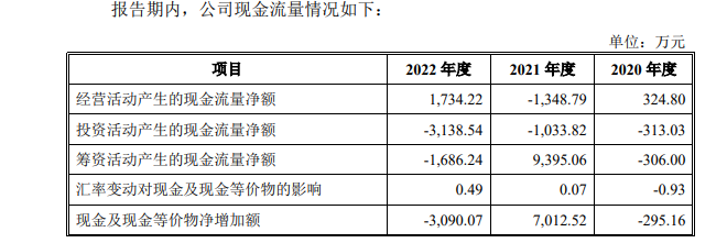 除了经营活动现金流承压外,黄山谷捷其他类现金流情况也难言乐观。2022年,其投资活动现金流净额、筹资活动现金流净额双双为负值。