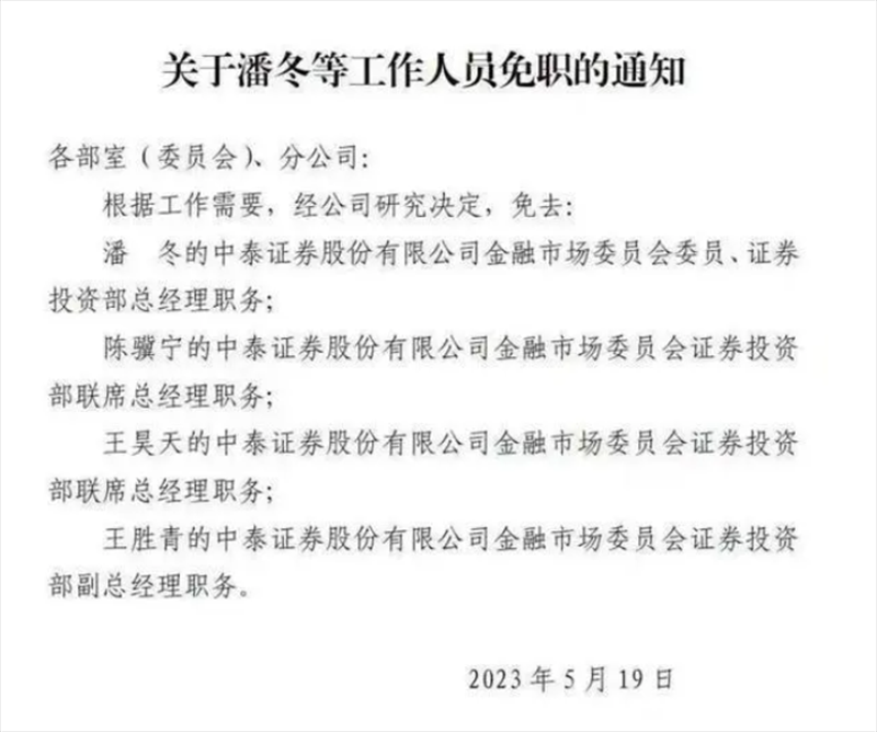 首先是业务和人事变动问题。据网上流传的消息,中泰证券大刀阔斧地全员解散了自营部门,并且免去了4位级别较高的负责人的职务,包括金融市场委员会委员、证券投资部总经理潘冬等。