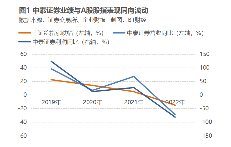 就连2023年一季度券商业绩回暖,也主要是因为当季A股表现回升。4月初,中泰证券在行业内一马当先率先披露季报,营收净利同比双增,营收录得35.7亿元、同比增长92.77%,归属净利润录得11.53亿元,同比增长424%。那时候上证指数走出“小阳春”行情,当季上涨5.94%。