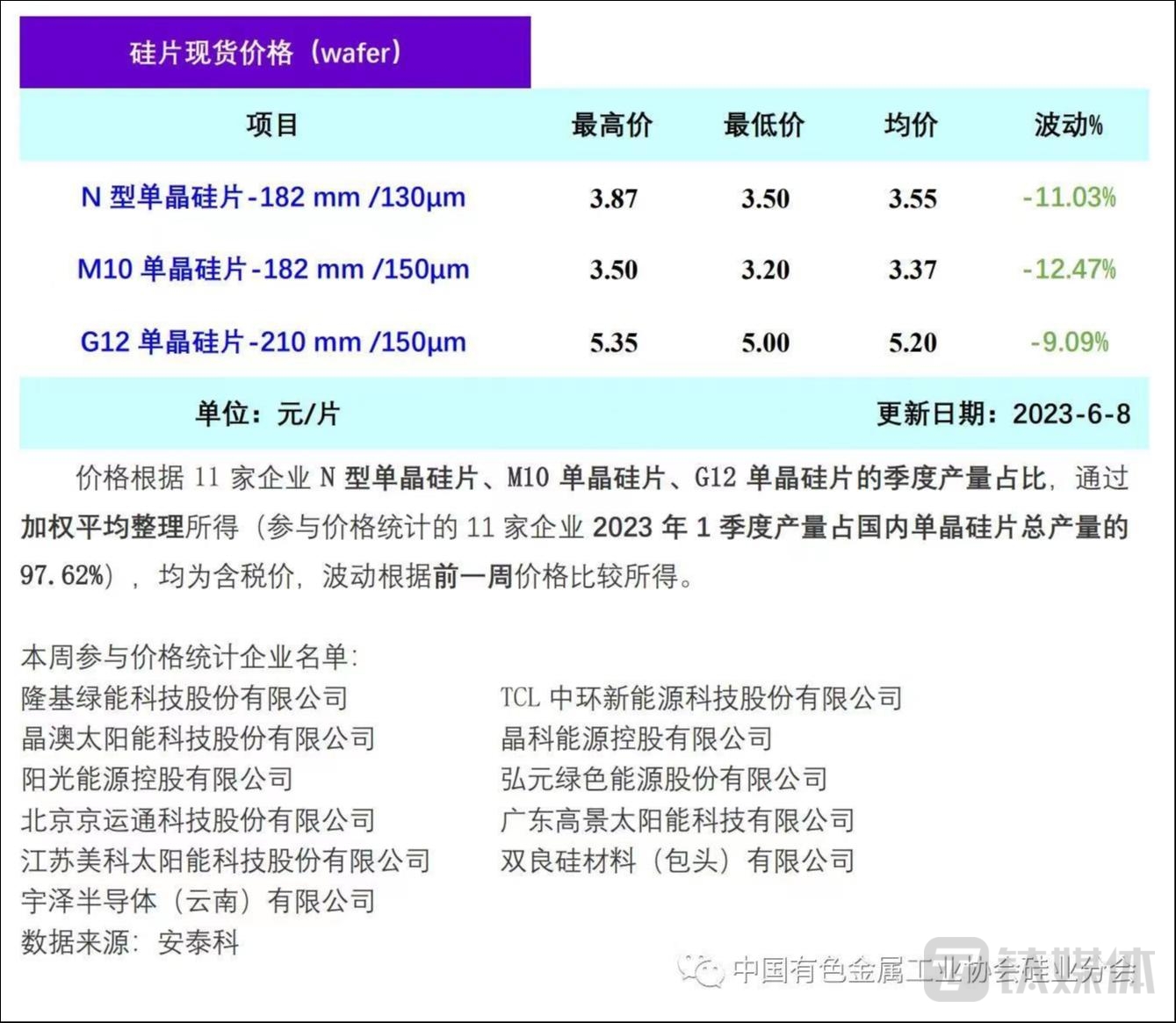 消息面上,据硅业分会最新研究显示,截至6月8日,硅片价格扩大跌幅。N型单晶硅片(182 mm /130μm)成交均价为3.55元/片,周环比降幅11.03%;M10单晶硅片(182 mm /150μm)成交均价为3.37元/片,周环比降幅为12.47%;G12单晶硅片(210 mm/150μm)成交均价为5.20元/片,周环比降幅为9.09%。硅片价格扩大跌幅,主要原因是供过于求。