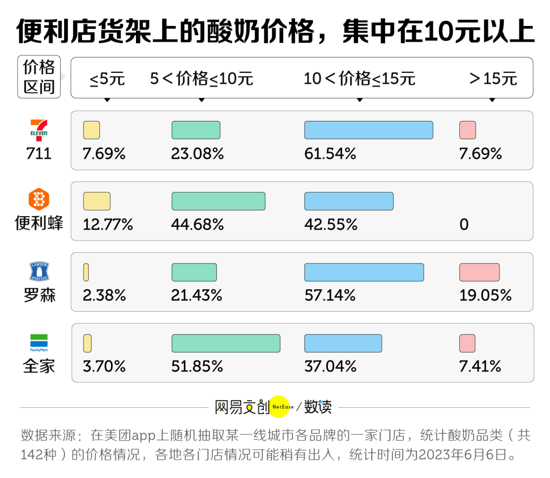 我们在外卖软件上统计了几家便利店共 142 种酸奶产品的价格,随机抽样的便利店销售的大部分酸奶价格集中在 10 元以上,小于 5 元的酸奶占比几乎在 10% 以下,而像罗森则有四分之三的酸奶超过 10 元。