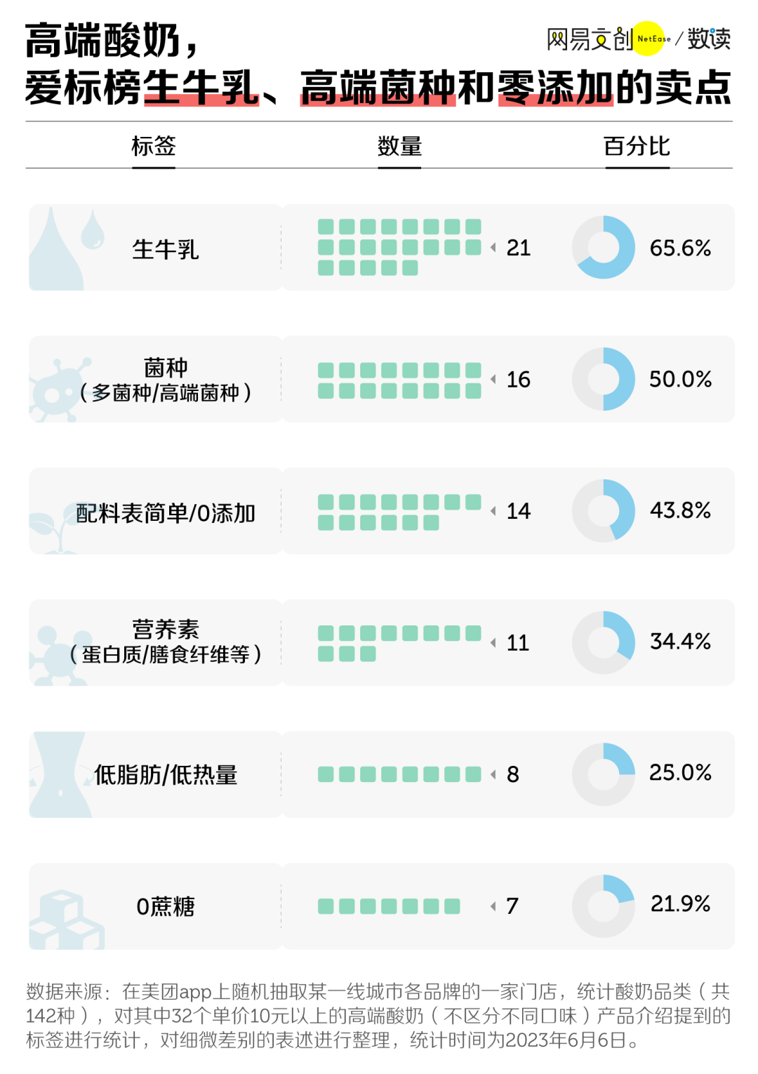 牛奶想走高端化,无非最常见的就是强调奶源和营养价值,如果谈到技术更新,消费者也很难有具体的感知;而低温酸奶想走高端化,在上面的标签统计中我们已经领受到,口味、配料、菌种等各方面都有差异化打法的空间。
